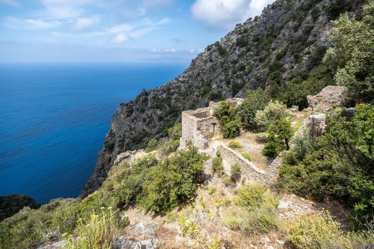 Pe cel mai înalt punct din interiorul orașului, ruinele vechii școli din Kayaköy oferă vedere asupra bisericii principale și a caselor de mai jos. Astăzi, un steag turcesc flutură pe un stâlp deasupra clădirii.