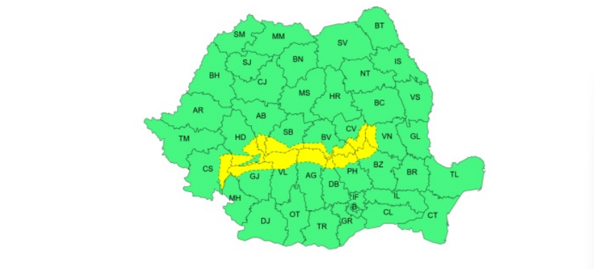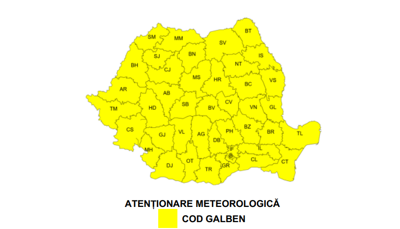 Potrivit meteorologilor, luni, între orele 10:00 - 21:00, în toată ţara, va fi Cod galben de intensificări ale vântului şi vijelii, cu viteze în general de 50 - 70 km/h, iar la altitudini mari de 90 - 110 km/h. În Banat, Crişana, Maramureş, Transilvania, jumătatea sudică a Moldovei, nordul Munteniei şi al Dobrogei, local vor fi perioade cu instabilitate atmosferică accentuată, ce se va manifesta prin averse, descărcări electrice şi izolat grindină.