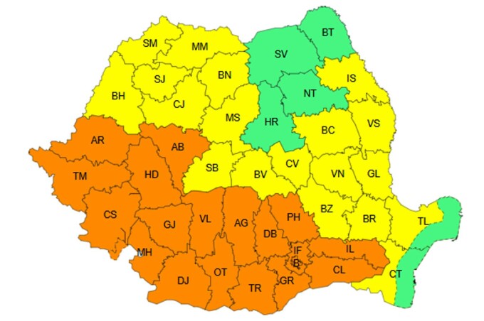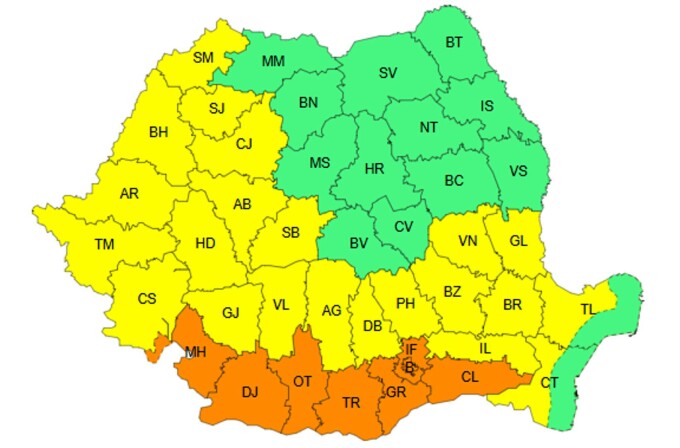 Meteorologii au emis o avertizare cod portocaliu de caniculă valabilă în intervalul 24 iulie, ora 10 – 25 iulie, ora 10, pentru sudul şi vestul Olteniei, precum şi pentru sudul şi centrul Munteniei, unde valul de căldură va persista, va fi caniculă, disconfort termic accentuat, iar indicele temperatură-umezeală (ITU) va depăşi pragul critic de 80 de unităţi.
