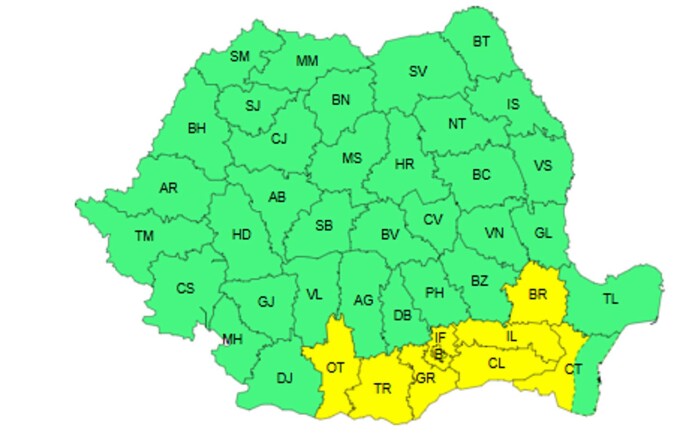Sunt marcate cu Cod galben judeţele Olt, Teleorman, Giurgiu, Ilfov, Călăraşi, Ialomiţa, Brăila şi parţial Constanţa dar şi municipiul Bucureşti.