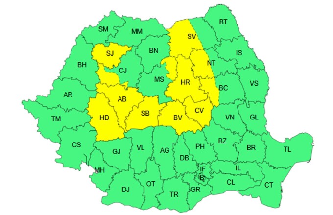 Judeţele marcate cu Cod galben de ploi sunt: Suceava, Hunedoara, Alba, Sibiu, Braşov, Covasna şi Harghita integral şi Cluj, Mureş, Suceava, Neamţ şi Bacău, parţial.