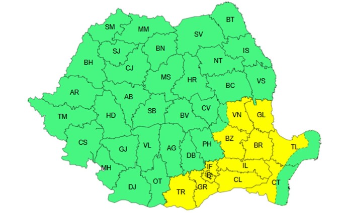 Se află sub Cod galben de caniculă Municipiul Bucureşti şi judeţele Brăila, Buzău, Călăraşi, Constanţa, Galaţi, Giurgiu, Ilfov, Ialomiţa, Tulcea, Teleorman şi Vrancea.
