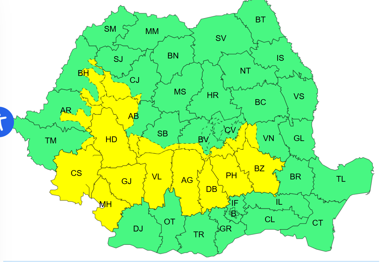 Un alt Cod galben va fi în vigoare de luni, de la ora 8.00, până marţi, la ora 10.00, în judeţele Hunedoara, Caraş-Severin, Mehedinţi, Gorj, Vâlcea, Argeş, Dâmboviţa, Prahova, Buzău şi parţial în judeţele Vrancea, Covasna, Braşov, Sibiu, Alba, Cluj, Bihor, Arad şi Timiş.