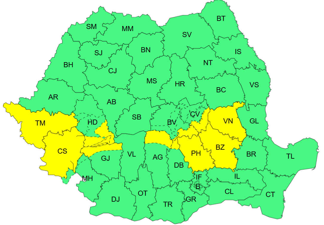 Cod galben de precipitații însemnate cantitativ, la munte ninsori viscolite și strat de zăpadă