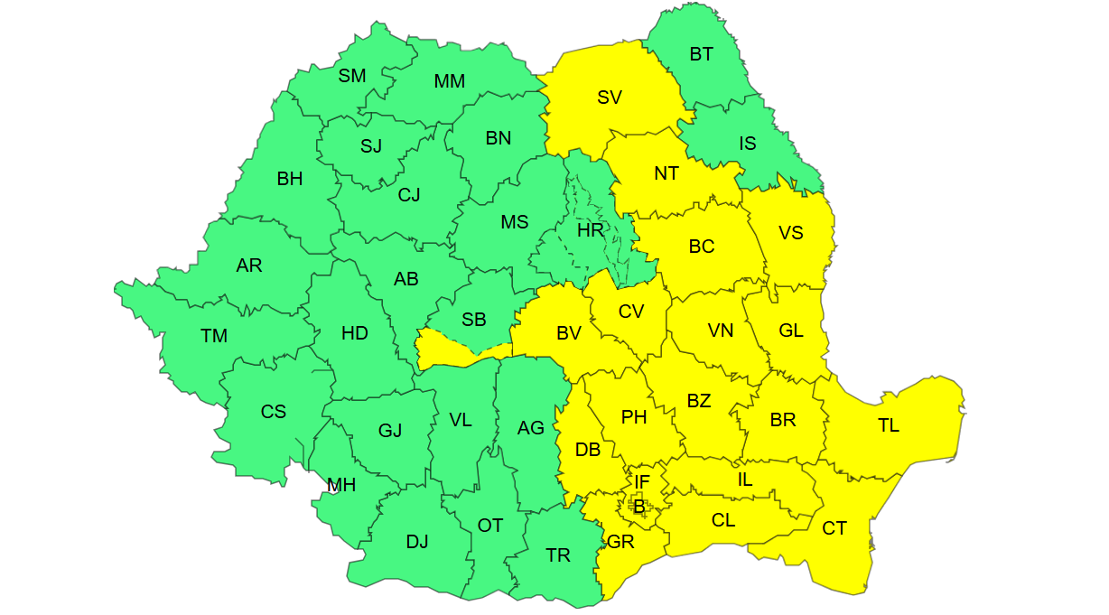 Cantitățile de apă vor ajunge local la 30–40 l/mp, iar temporar se vor înregistra intensificări ale vântului de 40–50 km/h în est și sud-vest.
