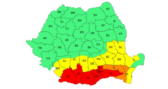În județul Ialomița și zona continentală a județului Constanța, se menține un cod portocaliu de caniculă, cu maxime de 38-40 de grade și aceleași condiții de disconfort termic ridicat.