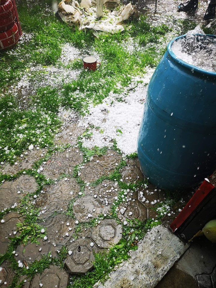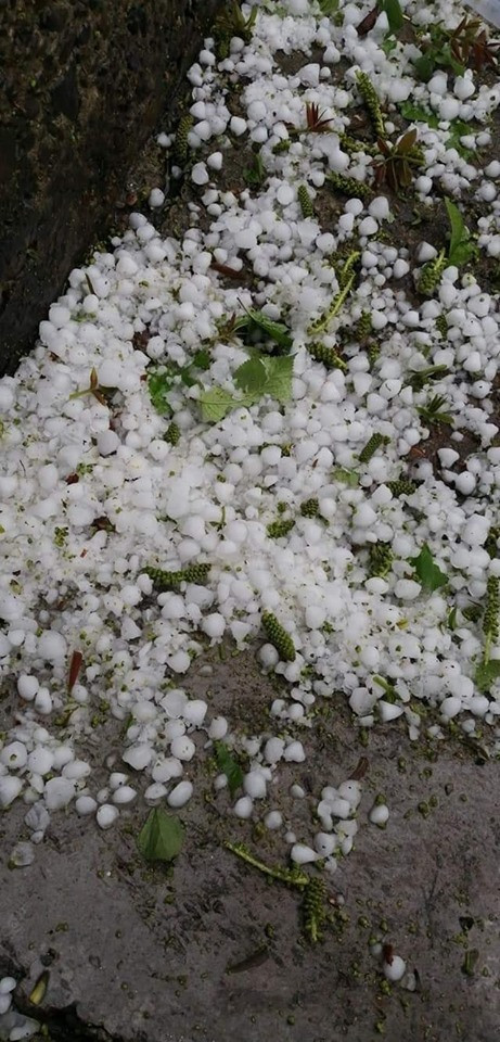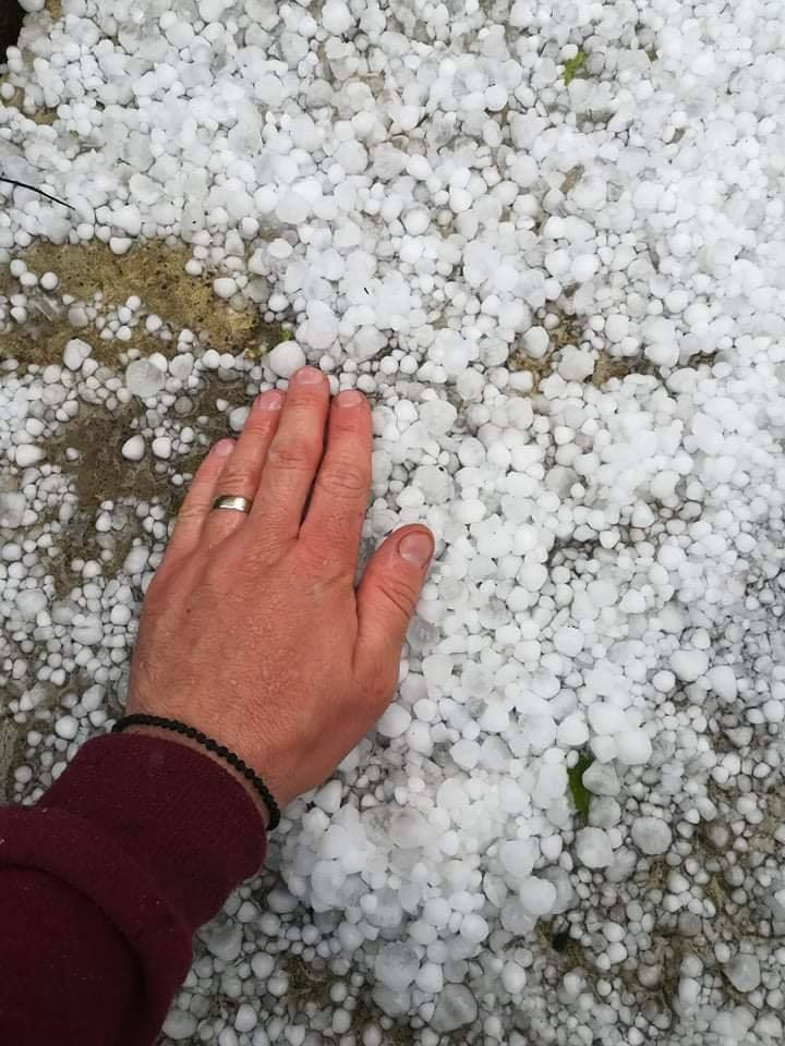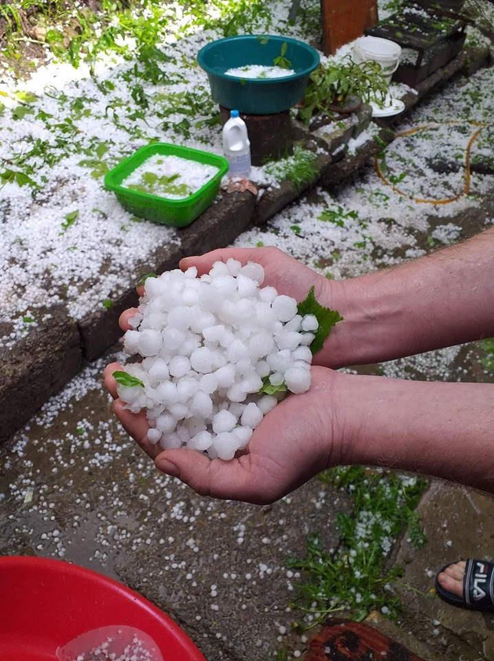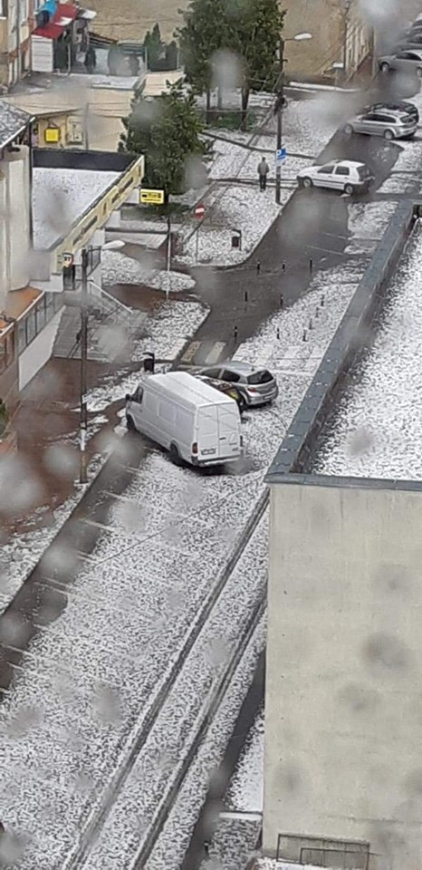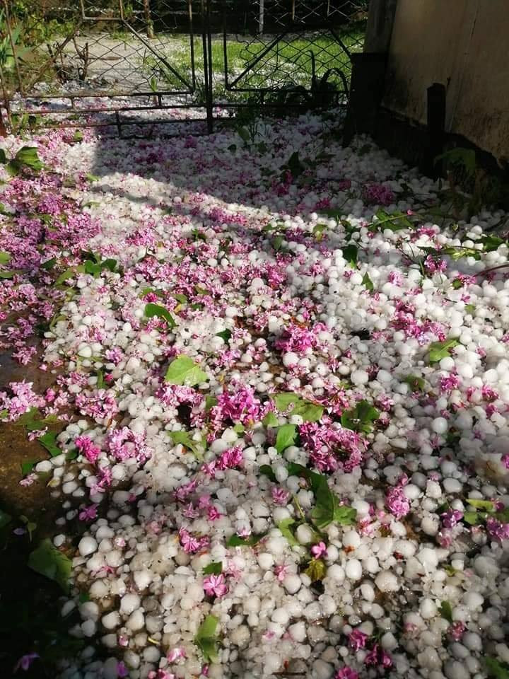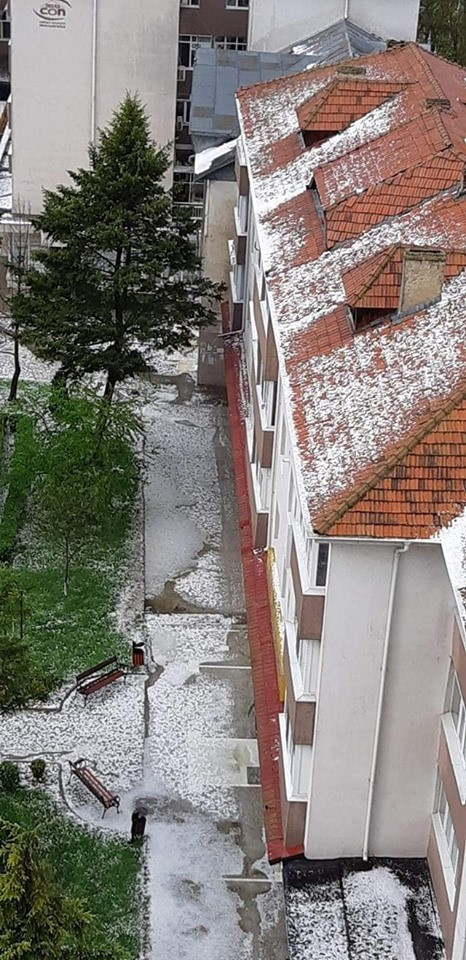 În imagini se vede că mai întâi s-a întunecat cerul, iar apoi a venit vijelia și grindina, care s-a așezat într-un strat gros.