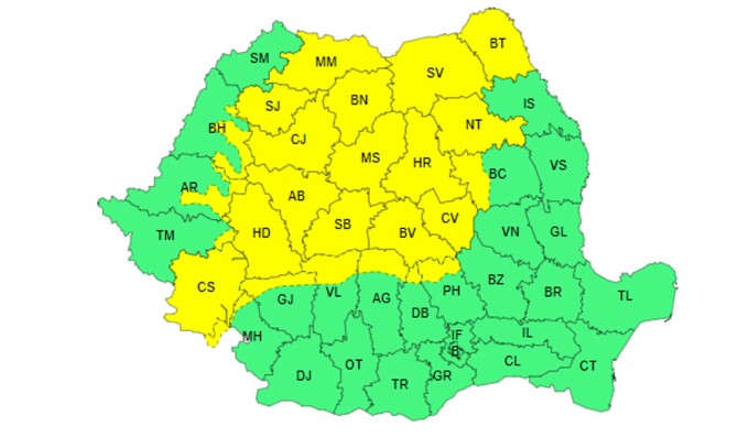 Meteorologii au emis un Cod galben de ploi, vijelii și grindină, valabil duminică pentru jumătate din țară. Codul galben intră în vigoare duminică între orele 13:00 și 21:00.