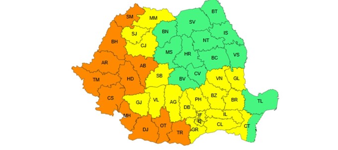 Codul portocaliu de caniculă şi disconfort termic accentuat, noapte tropicală, este valabil de duminică, de la ora 10.00, până luni, la aceeaşi oră, în judeţele Satu Mare, Bihor, Arad, Timiş, Caraş-Severin, Hunedoara, Alba, Mehedinţi, Dolj, Olt, Teleorman.
