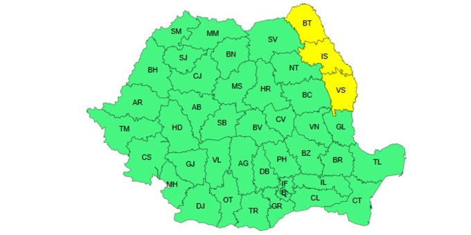 Un alt Cod galben, vizând însă intensificări ale vântului, va fi în vigoare de duminică, de la ora 21.00, până luni, la ora 6.00, în judeţele Botoşani, Iaşi şi Vaslui. Aici, temporar, vântul va avea intensificări, cu rafale de 50...60 km/h.