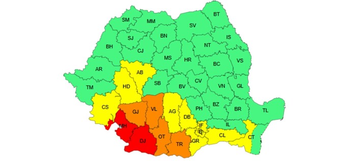 În judeţele Olt, Teleorman, Gorj şi Vâlcea va fi în vigoare o avertizare Cod portocaliu, în timp ce alte nouă judeţe şi Capitala vor fi sub Cod galben. Pentru şase judeţe a fost emis, pentru luni, Cod galben de vânt puternic.