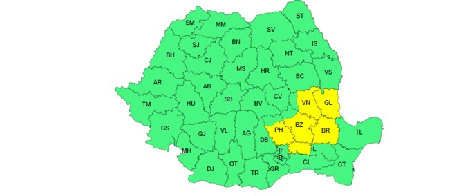 Un alt Cod galben, privind intensificări ale vântului, va fi în vigoare luni, între orele 6.00 şi 18.00, în judeţele Galaţi, Brăila, vestul judeţului Ialomiţa, zona joasă a judeţelor Vrancea, Buzău, Prahova, unde temporar vântul va avea intensificări, cu rafale de 50...70 km/h.