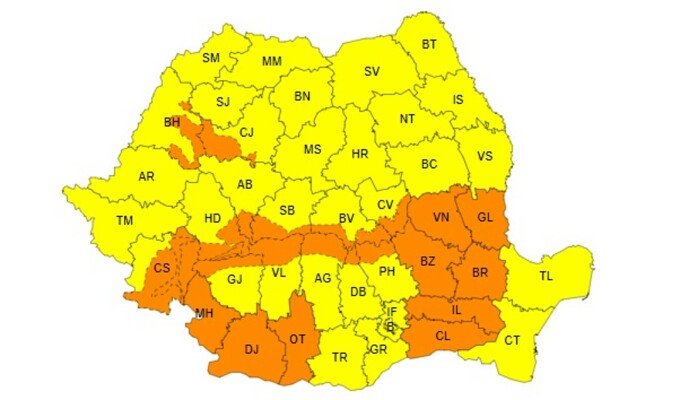 Pentru ziua de joi, meteorologii au emis două avertizări Cod portocaliu de vânt puternic şi viscol, valabile în zone din 23 de judeţe. În intervalul orar 12:00 - 23:00, în zona joasă a judeţelor Mehedinţi, Dolj şi Olt vor fi intensificări puternice ale vântului, cu rafale de 70...90 km/h.