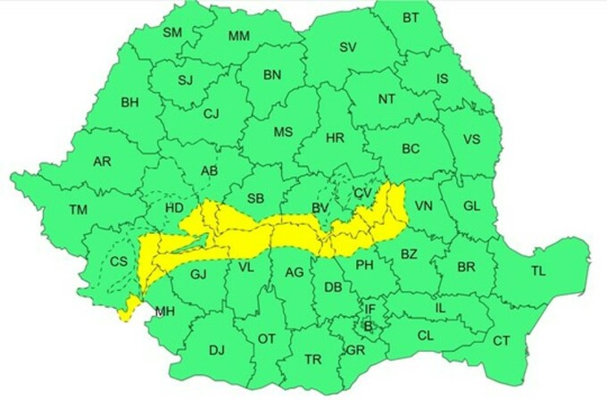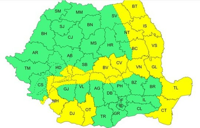 O atenţionare meteorologică Cod galben a fost emisă pentru intervalul 29 decembrie, ora 10 – 29 decembrie, ora 23, în Moldova, Dobrogea, sudul şi vestul Olteniei şi sud-estul Transilvaniei fiind progmozate intensificări ale vântului cu viteze de 50...70 km/h.