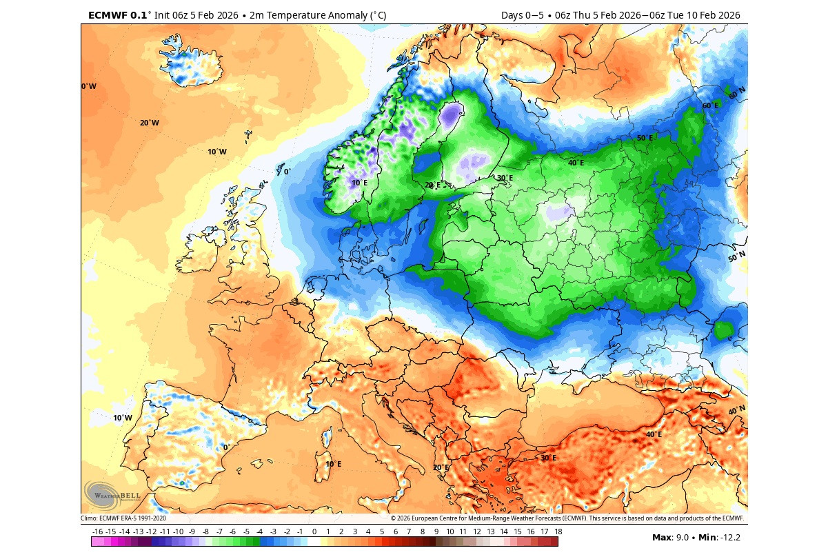 Hărțile meteorologice pentru începutul lui martie arată o anomalie termică negativă (adică temperaturi sub normal) care acoperă o suprafață mare din Europa, inclusiv România. Deși anomaliile nu par extreme în această prognoză de lungă durată, ele indică în mod clar o tendință de vreme mai rece decât ar fi normal pentru această perioadă.