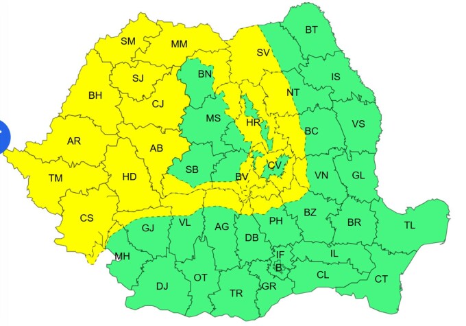 Administrația Națională de Meteorologie a emis un Cod Galben pentru Banat, Crișana, vestul Transilvaniei, Maramureș și zona montană, valabil până în dimineața zilei de 18 noiembrie. Vântul va fi temporar foarte puternic, cu rafale de 50–60 km/h, izolat de 70 km/h, iar în zonele montane mult mai intense.