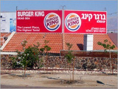 Pe malul Marii Moarte, cu niveluri de umiditate de 30% si briza sarata, turistii isi simt, intotdeauna, gaturile uscate. Dupa o zi intreaga de plutit sub soarele istovitor, o Coca-Cola si niste mancare de la Burger King, situat convenabil in apropierea uneia dintre cele mai sarate ape din lume, cu siguranta le potoleste turistilor, nu doar setea, ci si foamea.